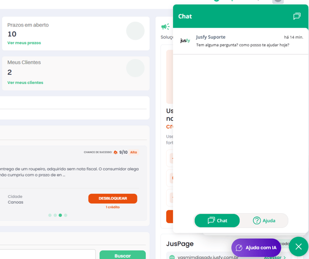 O suporte está disponível diretamente pelo chat dentro da plataforma Jusfy.