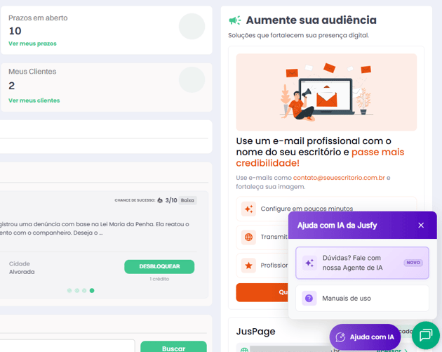 Nossa assistente virtual inteligente está disponível para esclarecer dúvidas sobre a plataforma e suas funcionalidades. Ela oferece direcionamentos imediatos e também disponibiliza o botão “Manuais de uso”, onde você encontra guias detalhados para explorar melhor as ferramentas Jusfy.