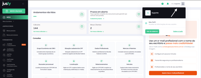 Na Jusfy, você pode consultar facilmente detalhes do seu plano e a data de renovação pelo seu perfil, garantindo total controle e organização no uso da plataforma.