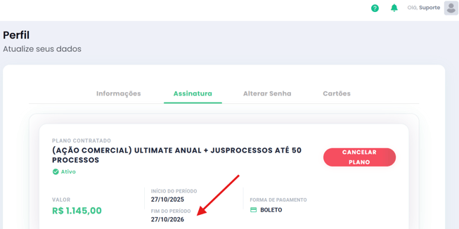 - A data de fim do ciclo indica quando ocorre a próxima cobrança do seu plano, desde que a assinatura esteja ativa e com pagamento em dia.