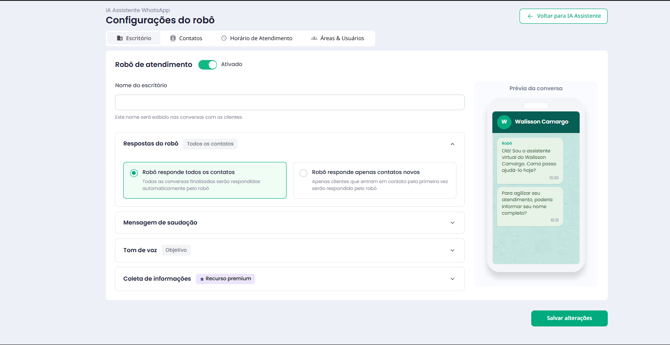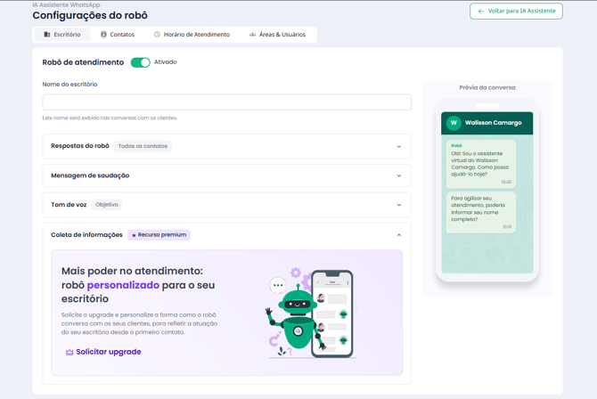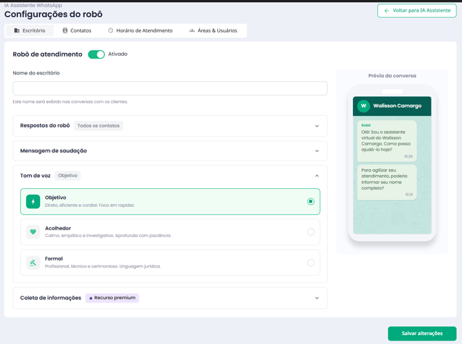 Nas configurações da IA Assistente WhatsApp, o escritório define exatamente como o robô irá atuar.