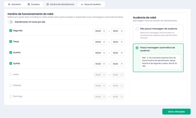O escritório pode definir em quais dias e horários o robô estará autorizado a responder mensagens automaticamente.