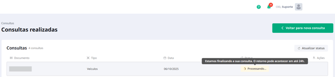 📌 Importante: O prazo máximo para retorno da consulta é de até 24 horas. Se, após esse período, o status continuar como “Processando”, você pode refazer a consulta diretamente na plataforma.