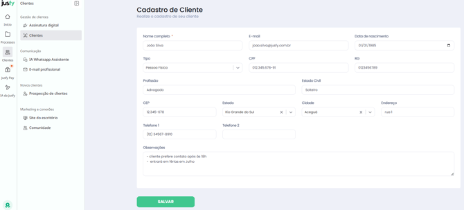 - Após realizar as modificações, clique em SALVAR para que os novos dados sejam aplicados em todo o ecossistema Jusfy.