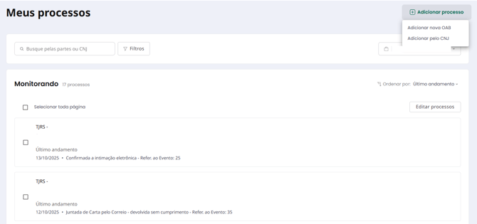 Adicionar novos processos à lista utilizando o botão Adicionar processo (com opção de inclusão por nova OAB ou pelo CNJ).